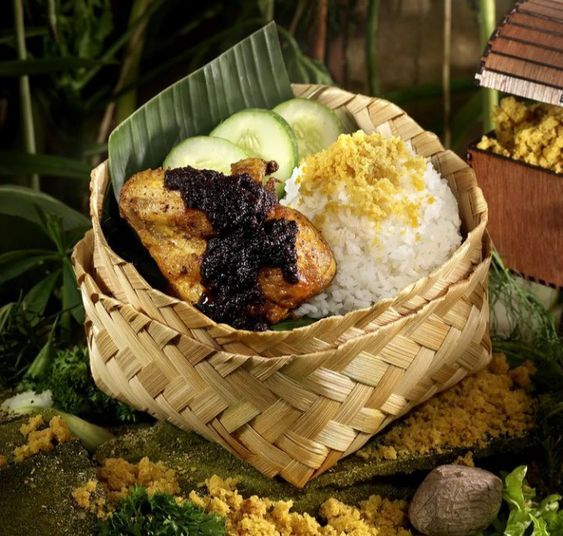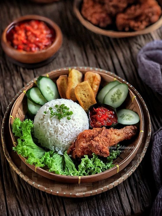 Aromatic white rice, Deep-fried chicken, fried boiled egg, fried peanuts, beans sprout salad, Mendoan tofu, and Sambal.