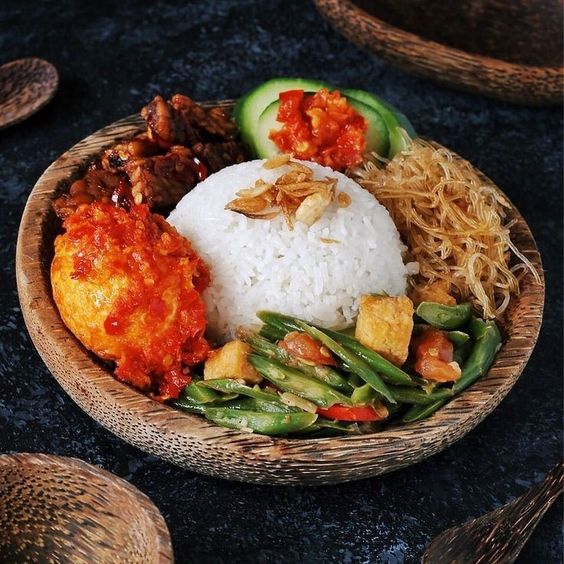 Aromatic white rice, Balado egg, Bacem tempeh, Stir-fried string beans, Bean sprout salad, Fried tofu, Fried chicken, and sambal.