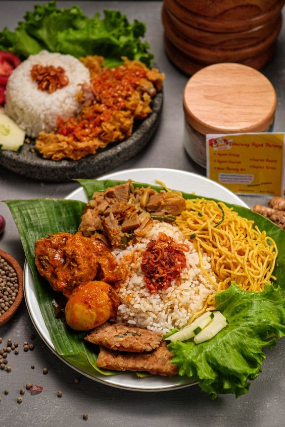 Aromatic white rice, Shredded chicken, Mendoan tempeh, Curry rebung, Bacem Tofu, Bacem tempeh, and sambal