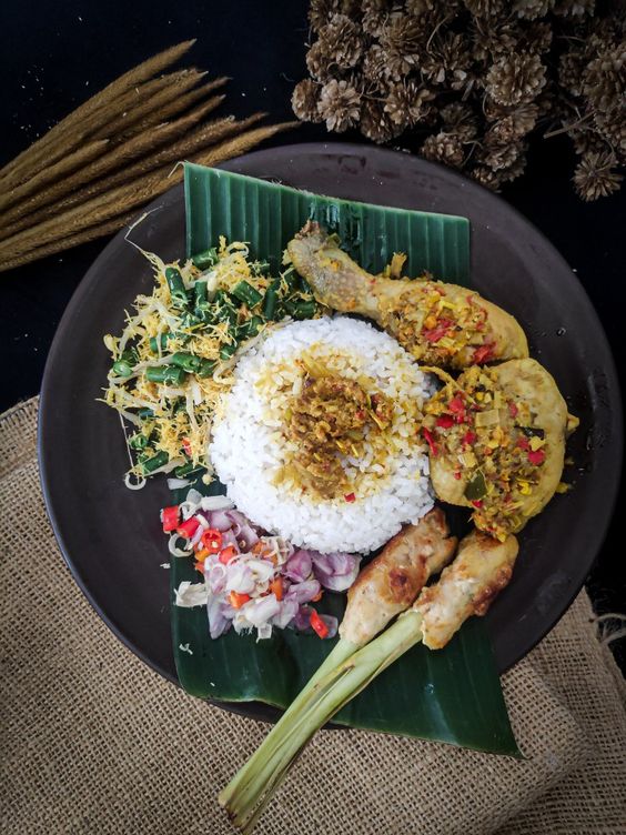 Aromatic white rice, Tofu satay lilit, Ayam betutu, String beans salad, Beansprout salad, Serundeng, and Marah sambal.